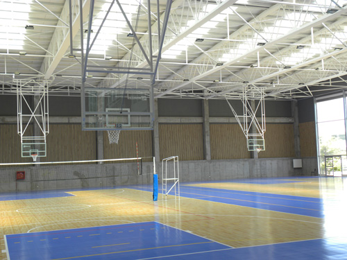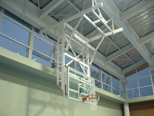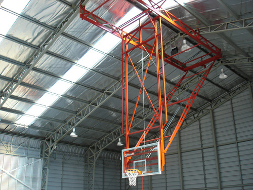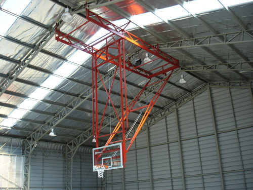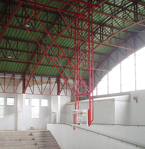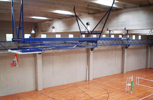 Su accionamiento puede ser manual o eléctrico. Esta estructura es instalada a las vigas del gimnasio mediante soldadura como a la vez son sujetos con pernos de anclaje que rebustecen la estructura.